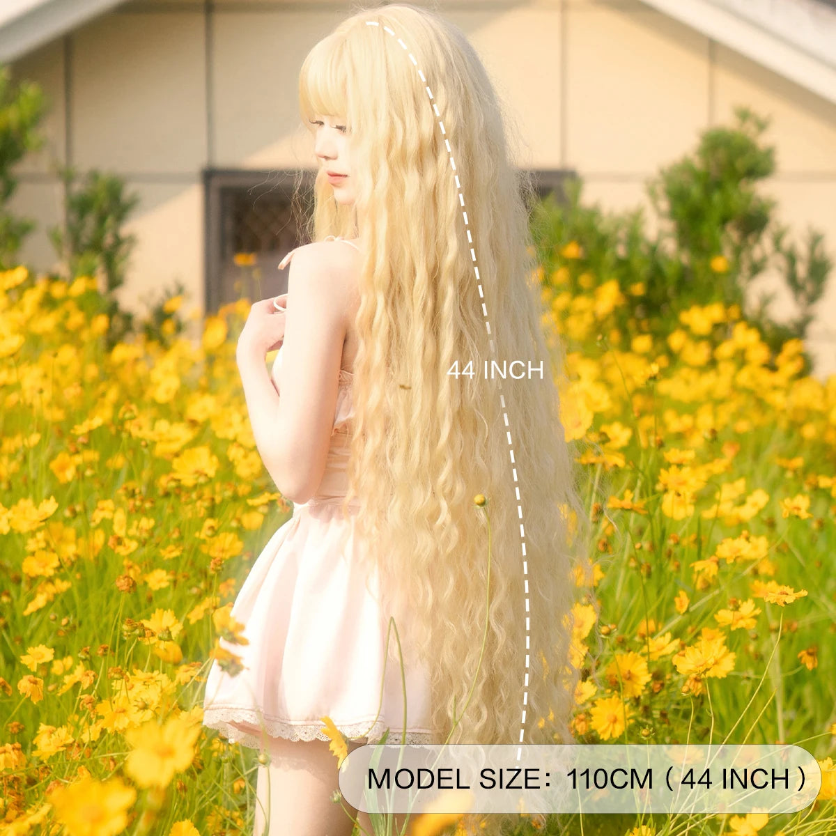 Halloween Wig 44 Inch Extra Long Blonde Cosplay Wigs With Bangs Loose Long Curly Blonde Lolita Wig Synthetic Heat Resistant Costume Wig